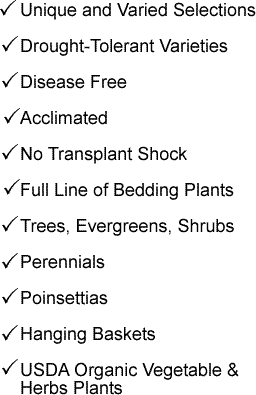 | It’s not too late to plant your garden and patio pots! We still have a full line of vegetable and herb starts, as well as many blooming annuals and perennials. We have a few different size hanging baskets and patio planters for quick and easy color. Come check out what we have available. | |||||||||||||||||||